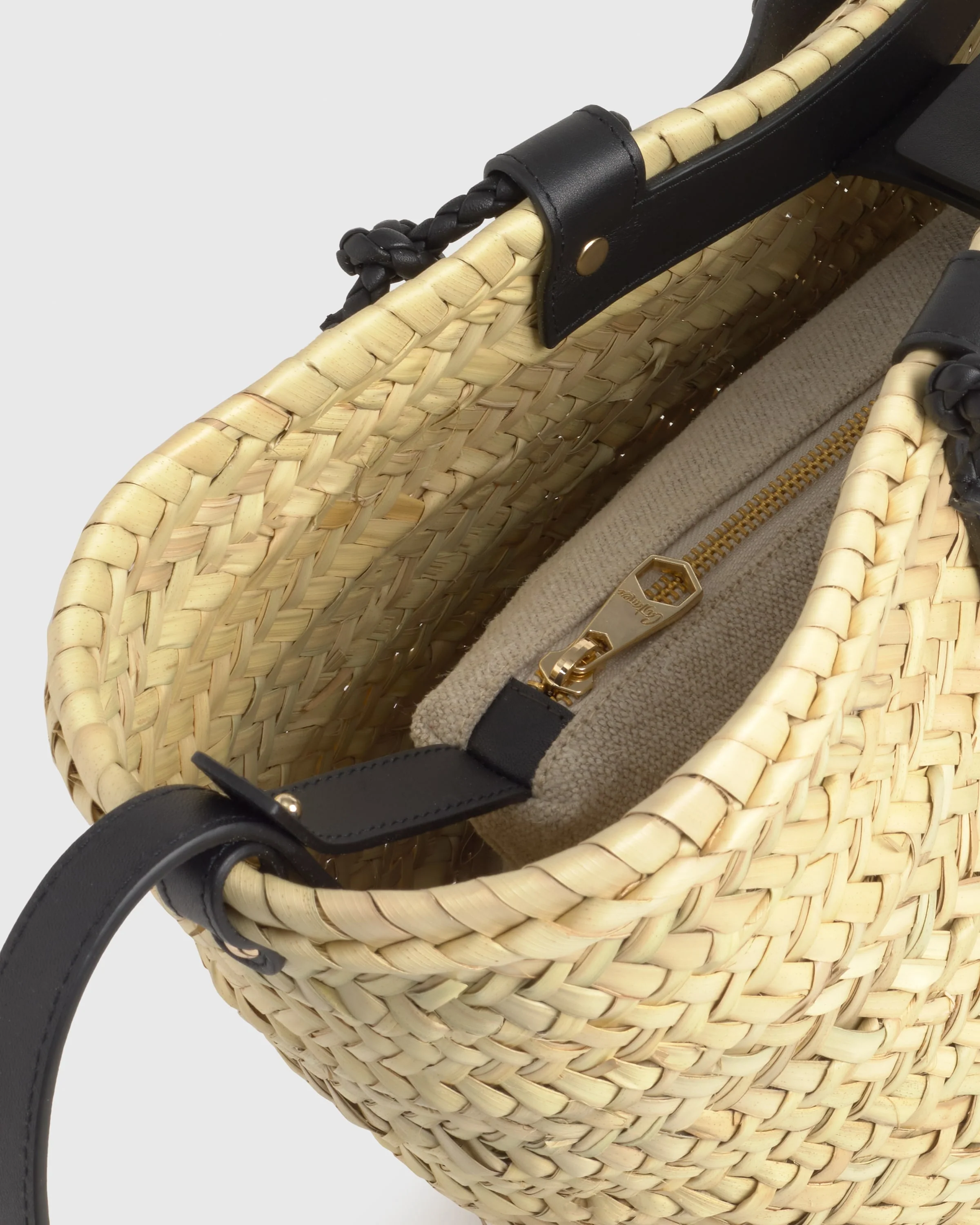 Capazo Campania en rafia natural con bolsillo exterior en cuero con el logo Castañer perforado. Bolsa interior extraíble con cremallera, cierre magnético y asas de cuero cortas y largas para llevar del hombro.