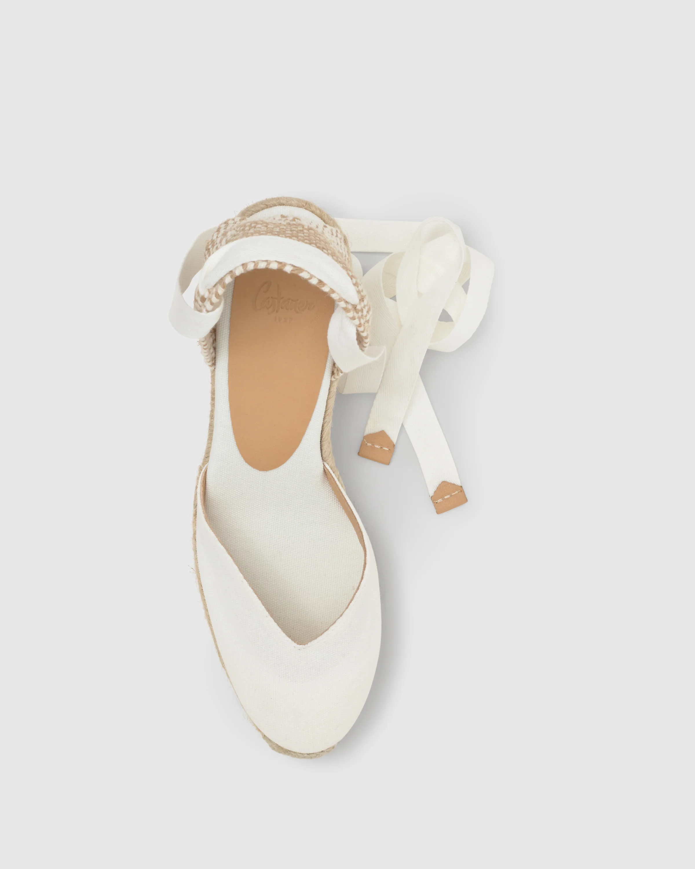 Icónica alpargata Chiara en algodón orgánico con cierre de cintas, plantilla acolchada y escote en V. Cuña de yute de 9cm.