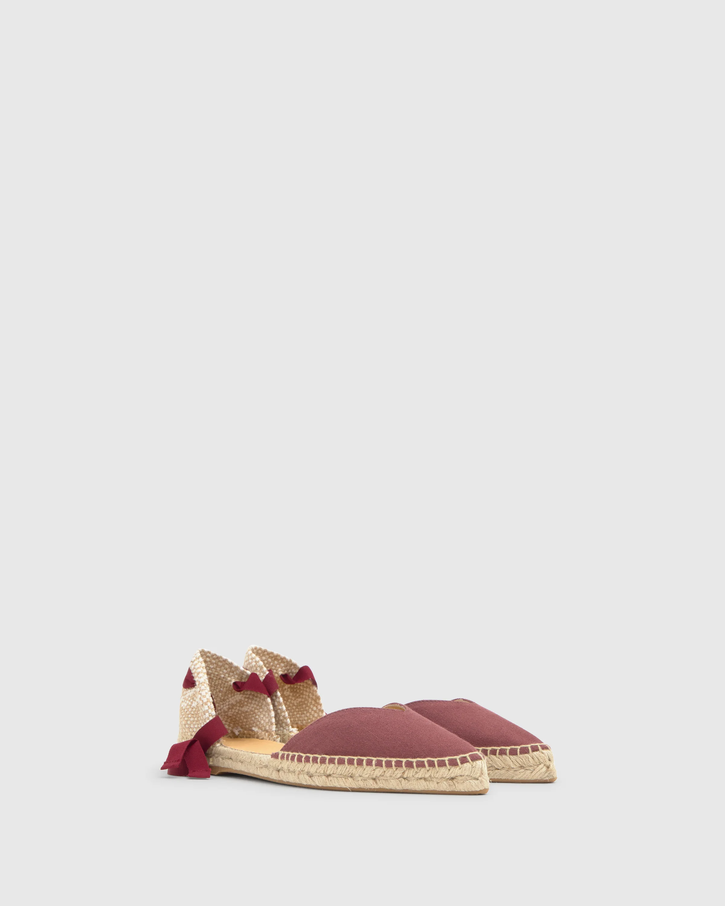 Alpargata plana Brava en lino con cierre de cintas, escote en V, punta afilada y suela de yute cosida a mano.