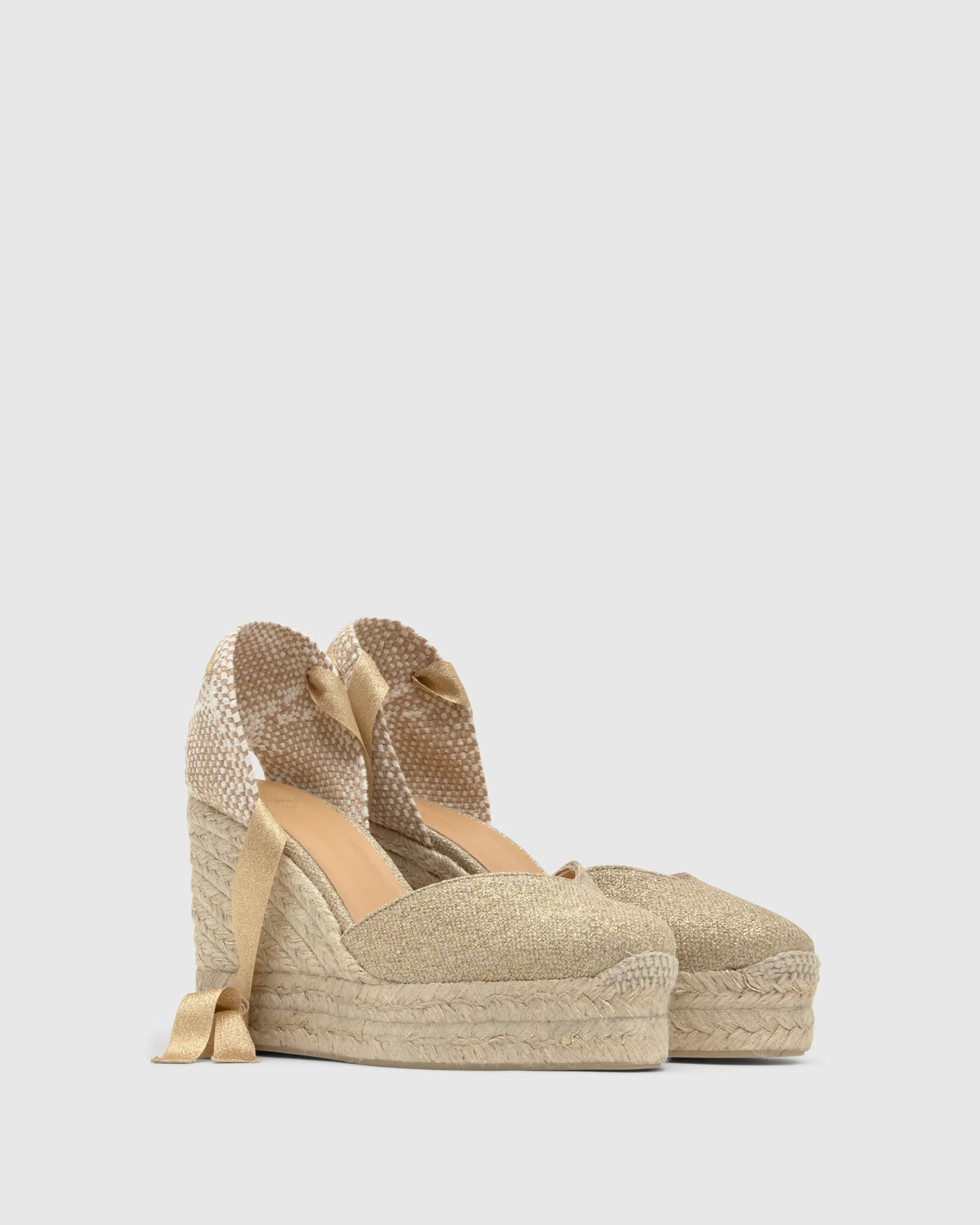 Icónica alpargata Chiara en lino metalizado con cierre de cintas, plantilla acolchada y escote en V. Cuña de yute y lurex de 11cm con doble plataforma.