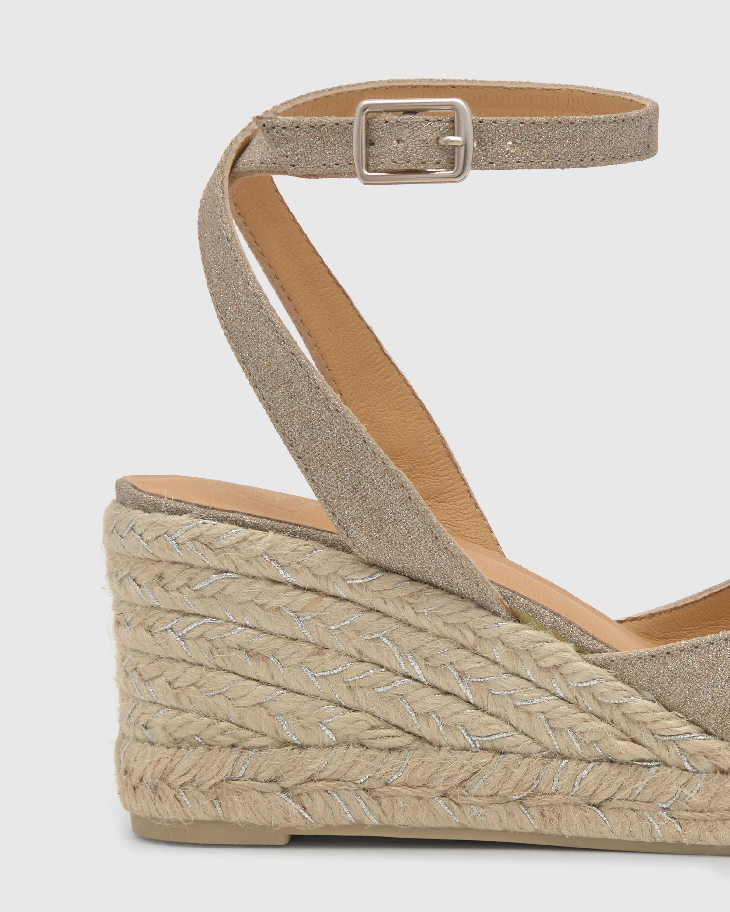 Alpargata Cybil en lino metalizado con cierre de pulsera, plantilla acolchada y cuña de yute de 7cm.