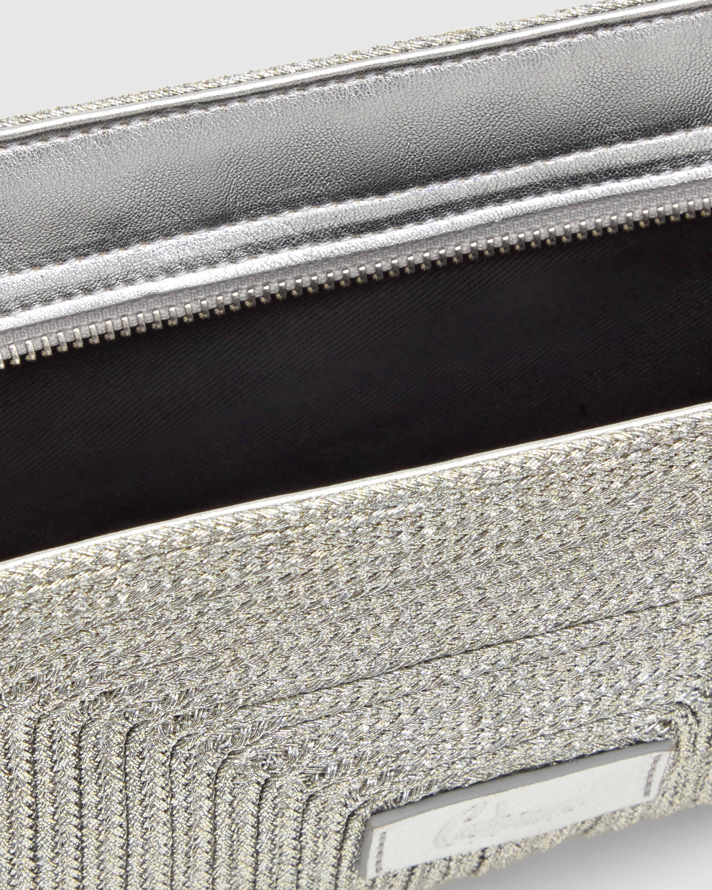 Bolso de mano Bali estilo pochette con trenzado metalizado artesanal, cierre de cremallera y asa para la muñeca y el hombro.