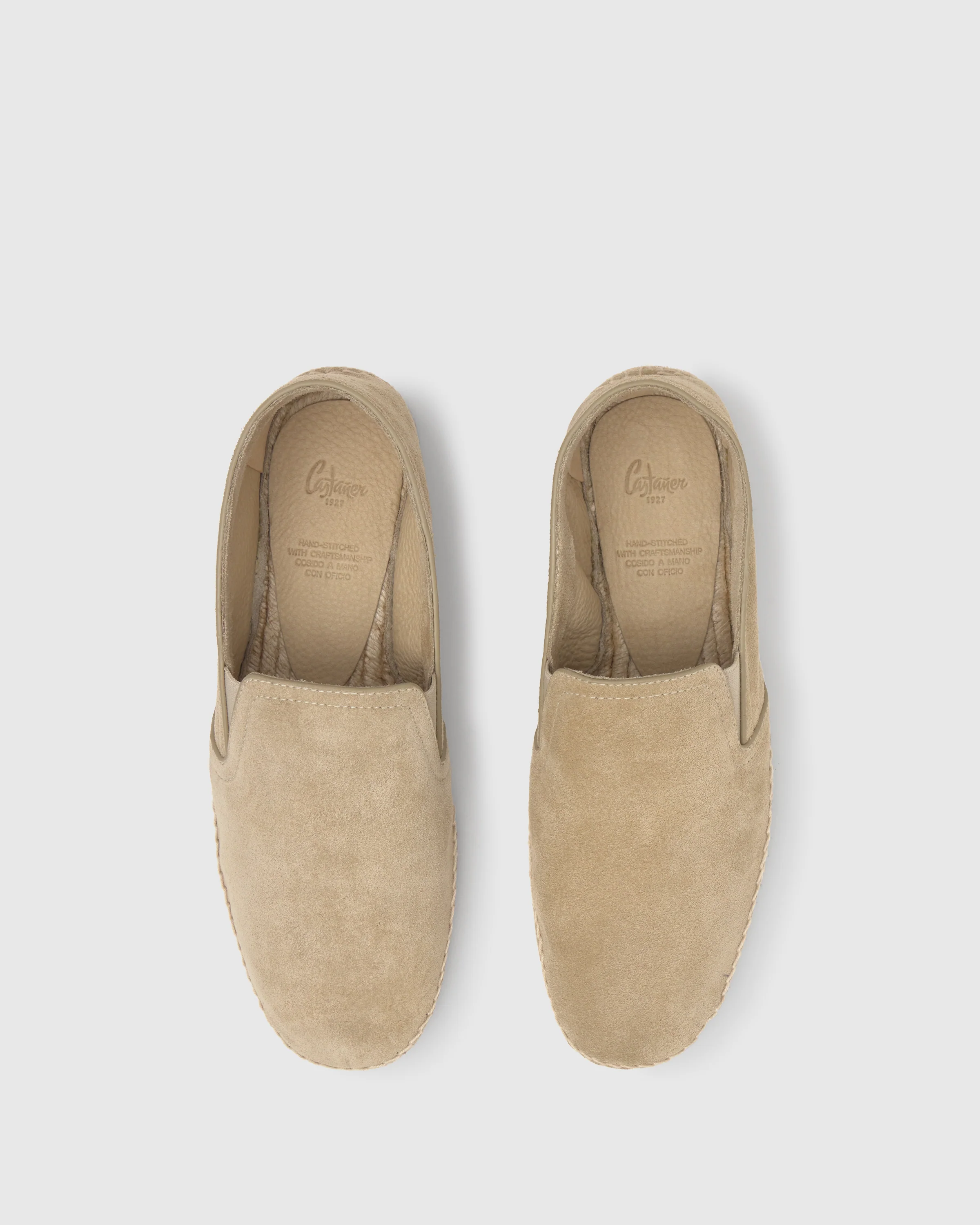 La colección Curated Edition encapsula la esencia de la singularidad, diseñada para aquellos que aprecian la creación como un acto de auténtico afecto. Cada pieza, elaborada con materiales nobles y moldeada por manos expertas, es el resultado de una cuidada selección donde cada detalle refleja la precisión y la dedicación de un oficio perfeccionado con el tiempo. Alpargata plana James estilo slip-on confeccionada en serraje de alta calidad certificado por Leather Working Group (LWG), reconocido por su textura suave, durabilidad y acabado mate. Cuenta con elásticos laterales, vivo de piel y cantos pintados y pulidos a mano, y suela de yute teñido con base de piel.